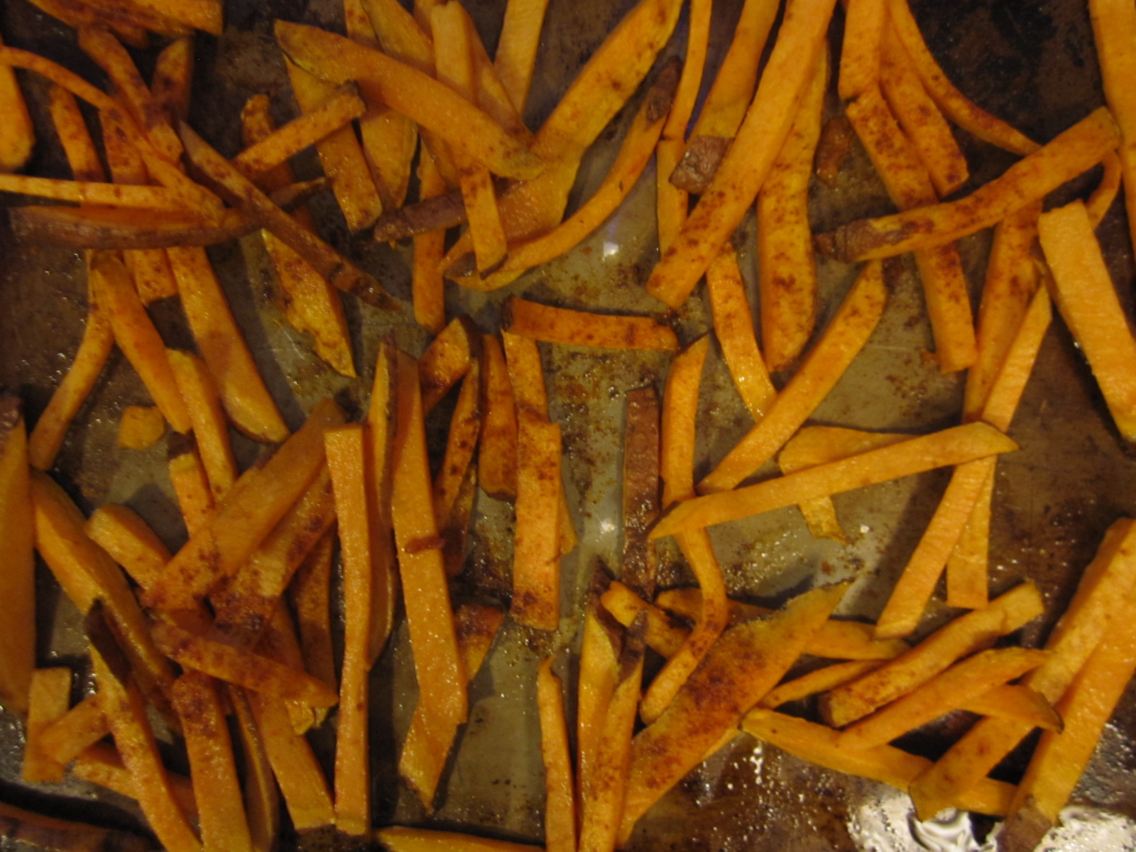 After the fries have soaked, place them in a tupper ware or a large plastic bag with olive oil, and shake them around until coated. Finally, place them on a baking tray, cover with cajun seasoning, salt, and pepper, and bake for about 30 minutes.