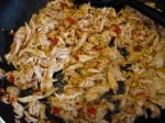- Then, attack this chicken with two forks, shred it up real nice, and throw it in a non-stick pan with some canned tomatoes, Tabasco sauce, barbecue sauce, and perhaps a bit more spice. Let the tomato juices come to a simmer and then turn off heat.