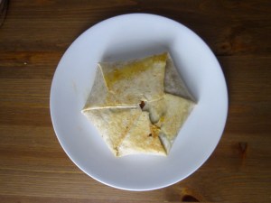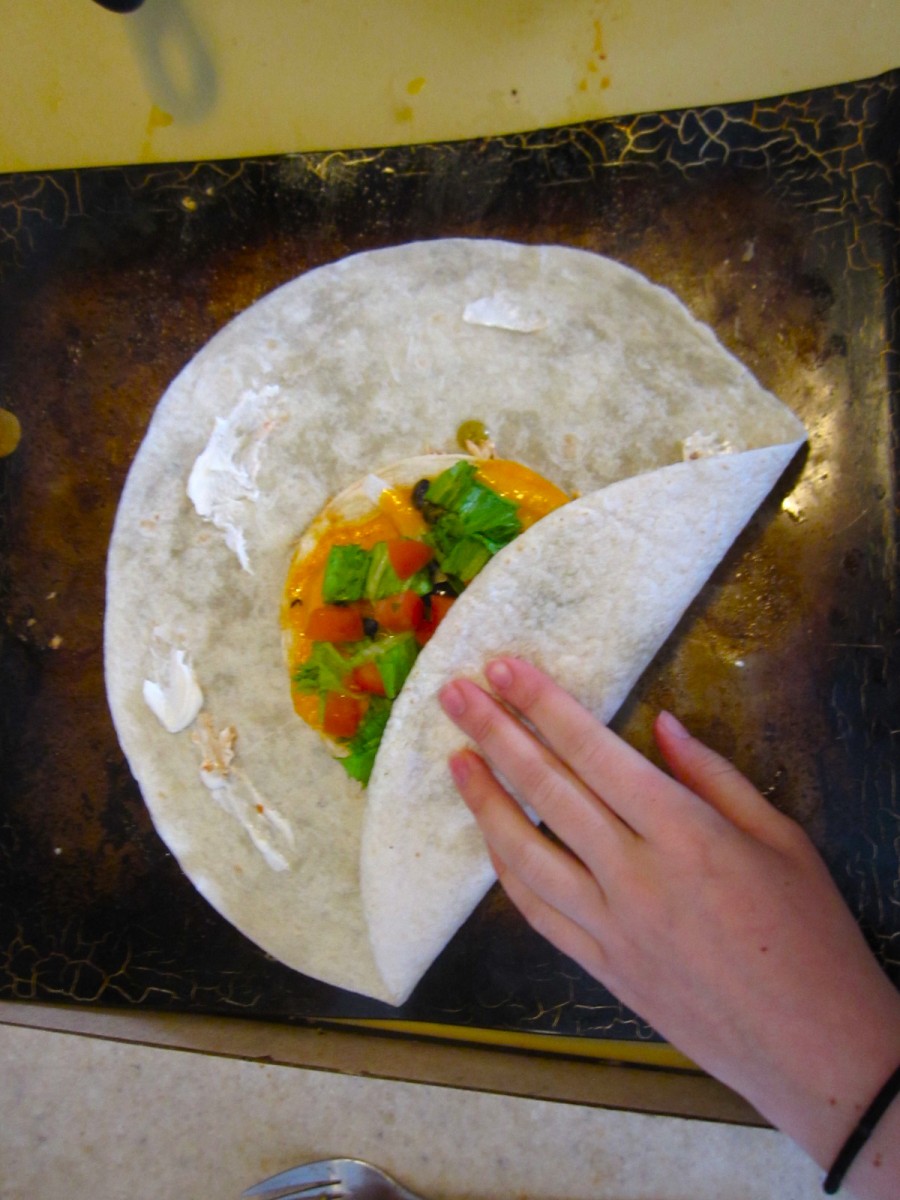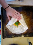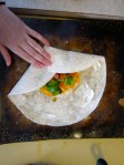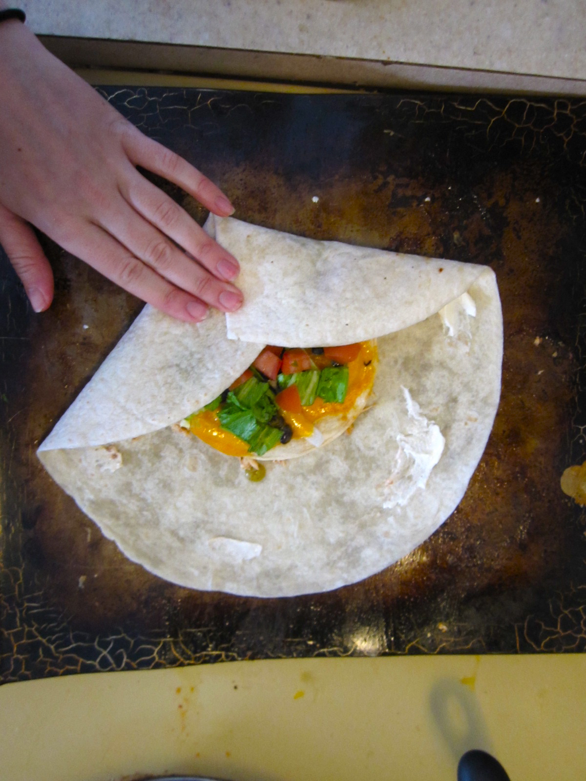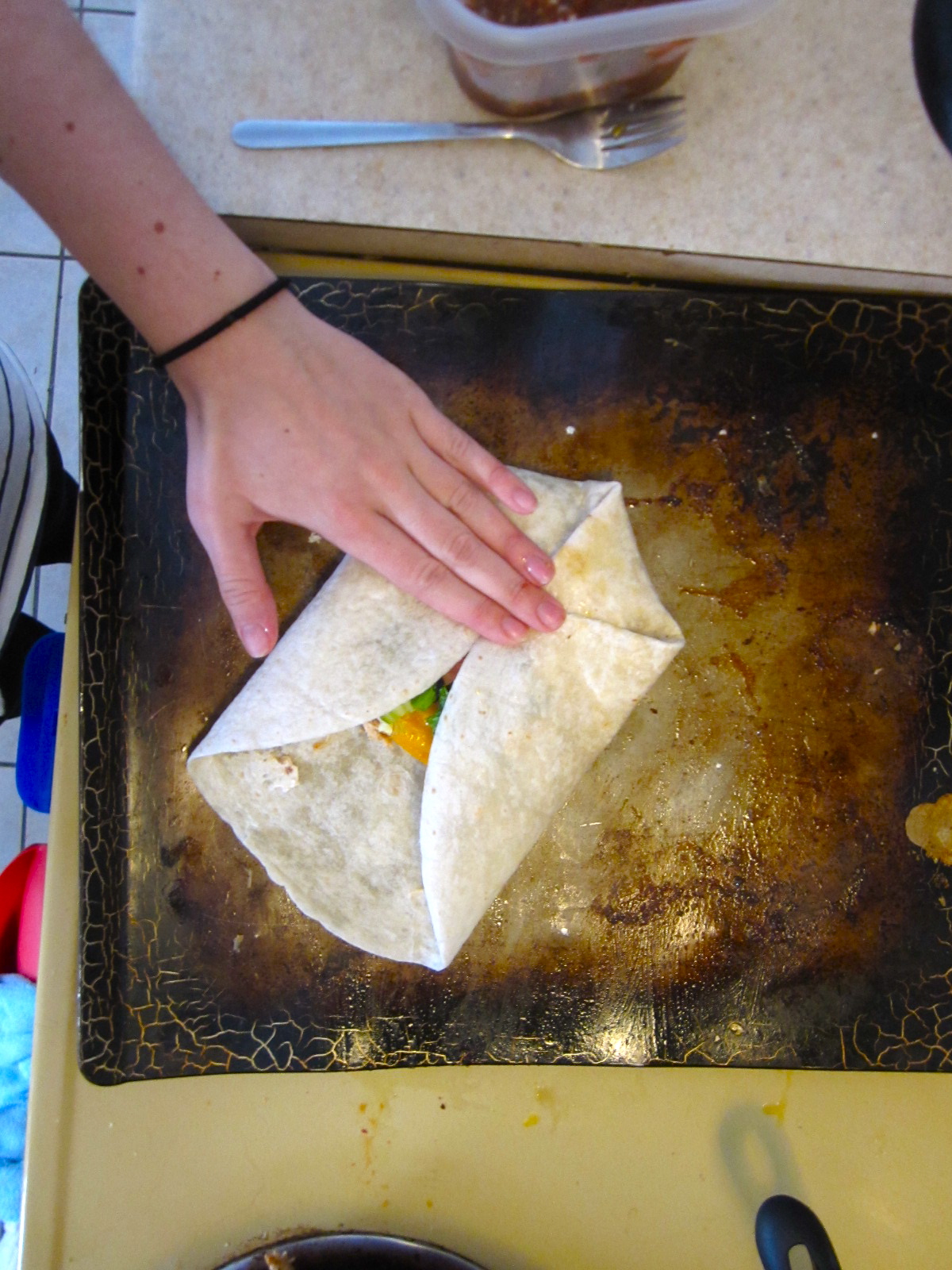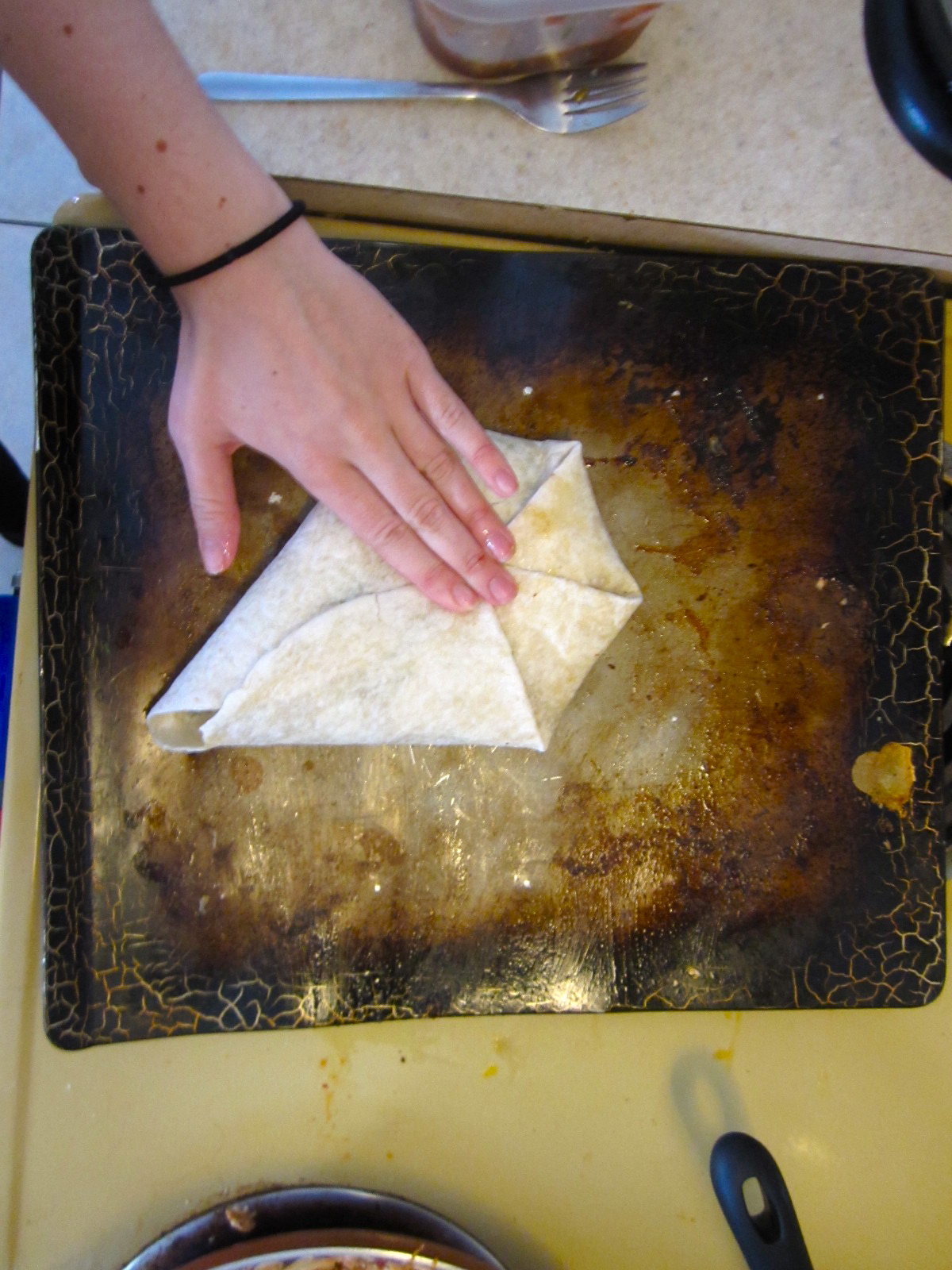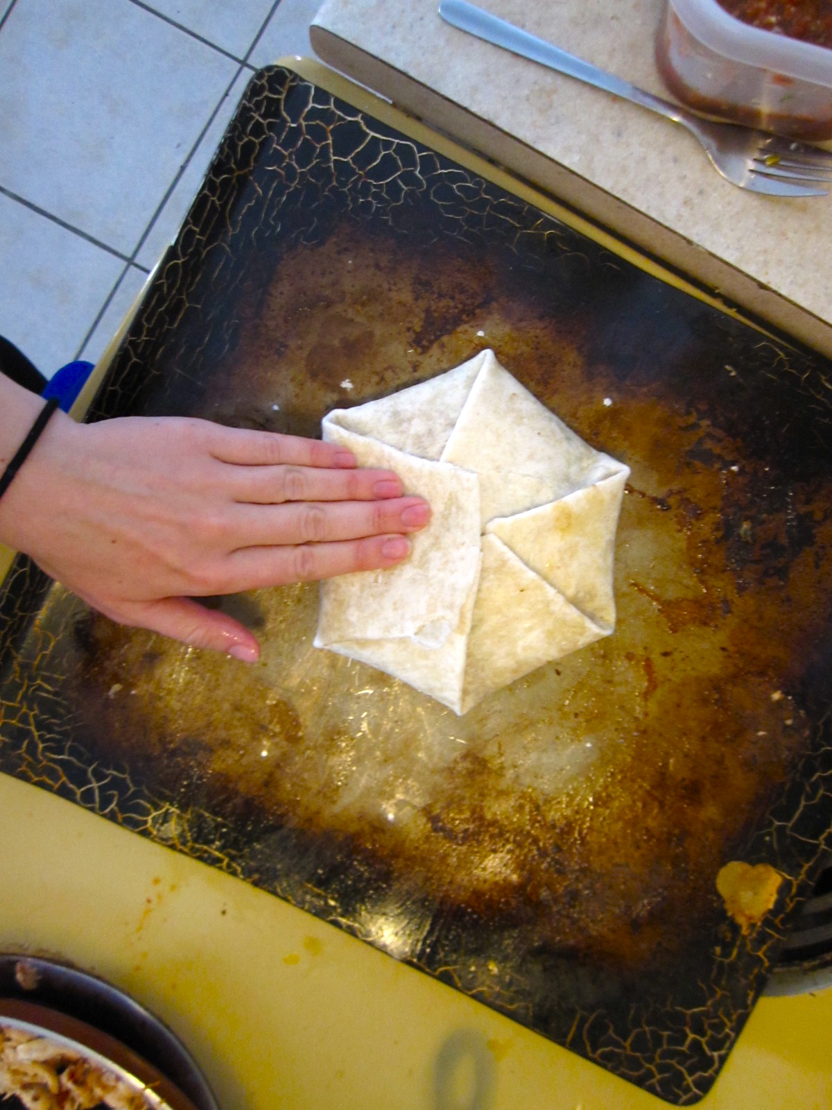 Do this in a clockwise motion, and it will be nice and folded. To cook this baby up, I put a bit of oil in a frying pan, placed this face up and put a heavy pot on top to keep it folded. Then, I flipped it over. It came out wonderfully!