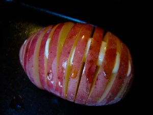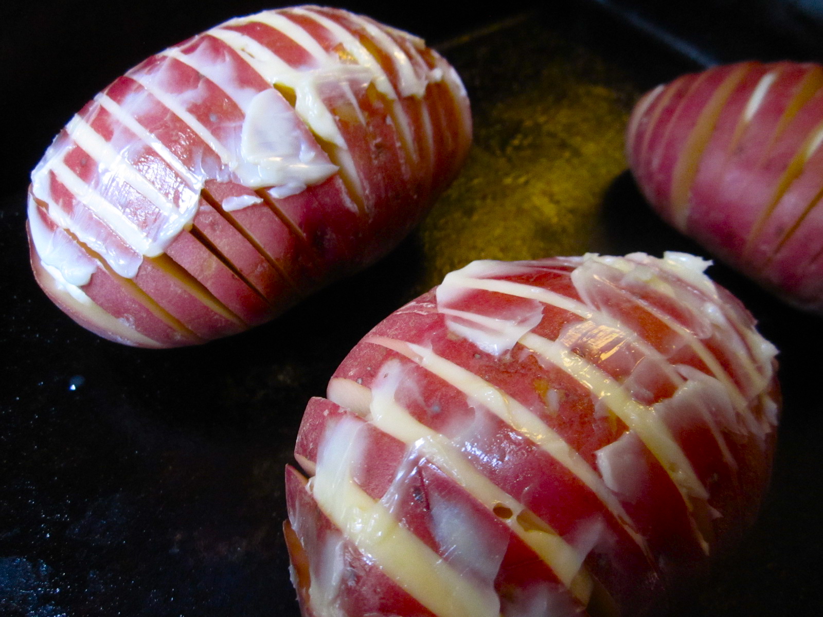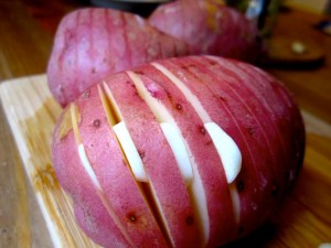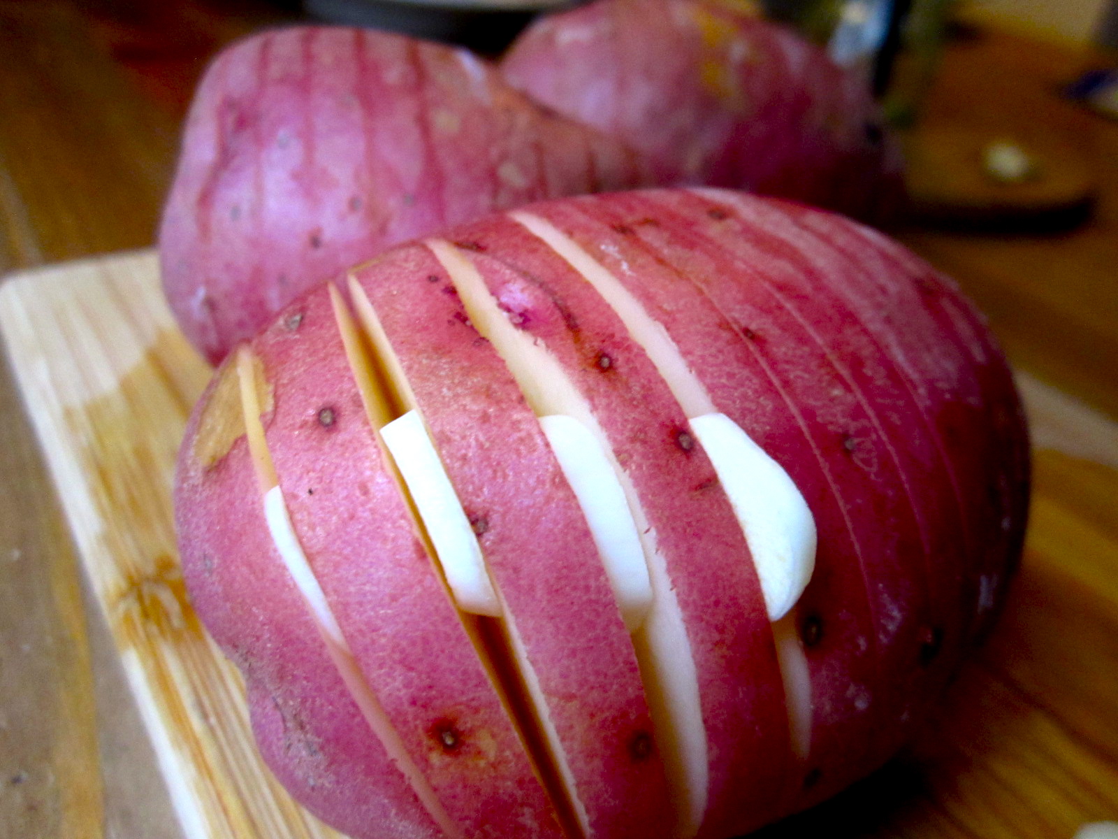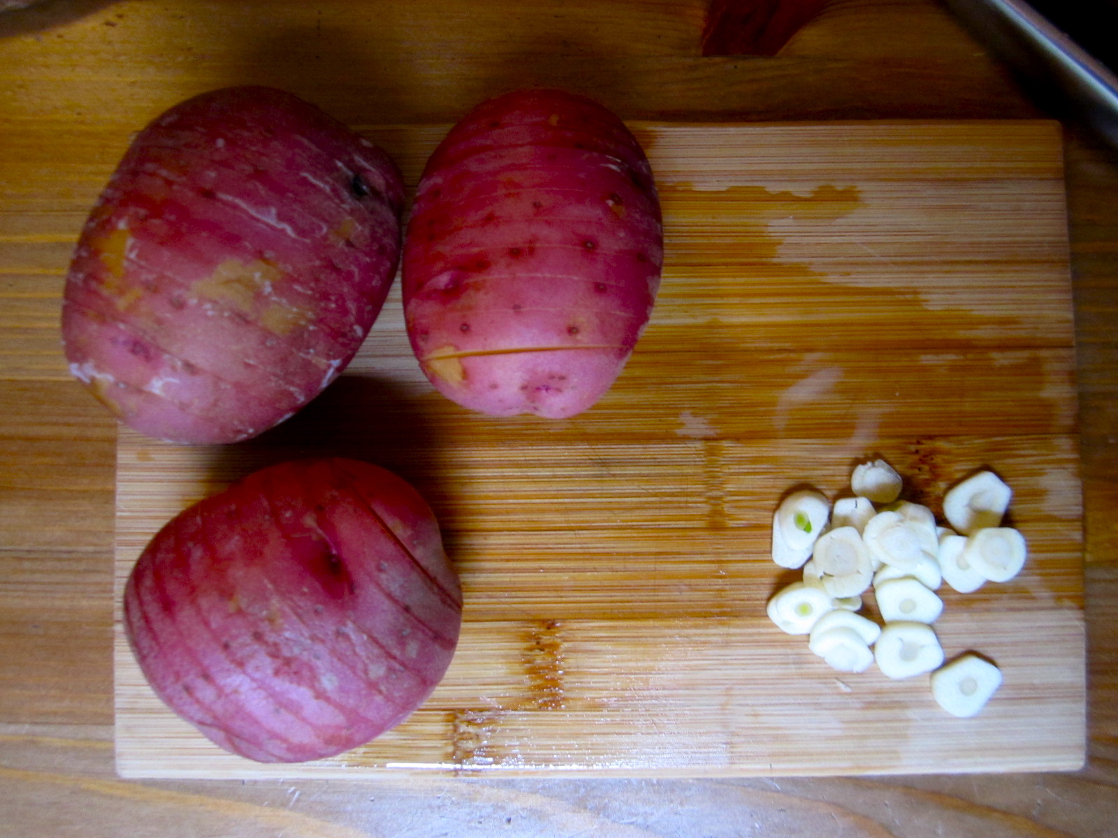 - Wash and scrub each potato, and cut thin slices into the potato. Each slice should cut half way through the potato. Sliver cloves of garlic as seen below.