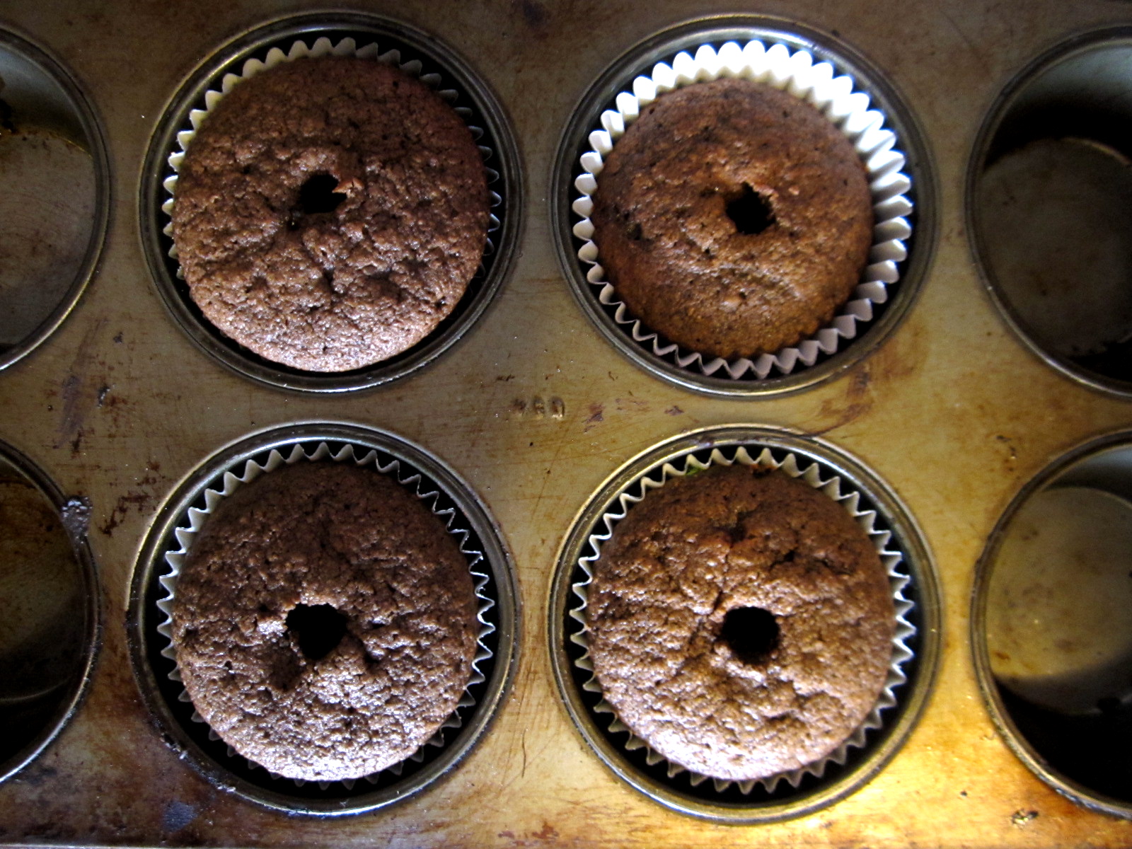 - With a funnel or a very steady hand, pour the ganache into the wholes of the cupcakes.