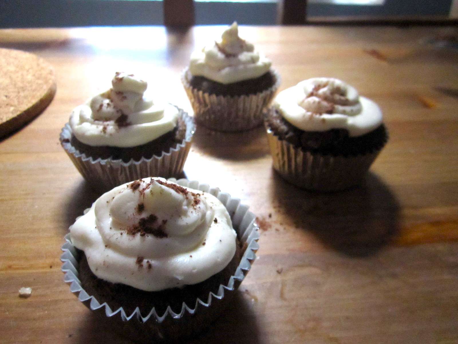 - Then, whip up the ingredients for the cream cheese frosting in a hand mixer. After the cupcakes have cooled, remove them from the baking pan. I put my frosting in a plastic bag, cut a tip from one end, and dressed the cupcakes with a twist. Followed by a small sprinkling of cocoa powder. Enjoy!