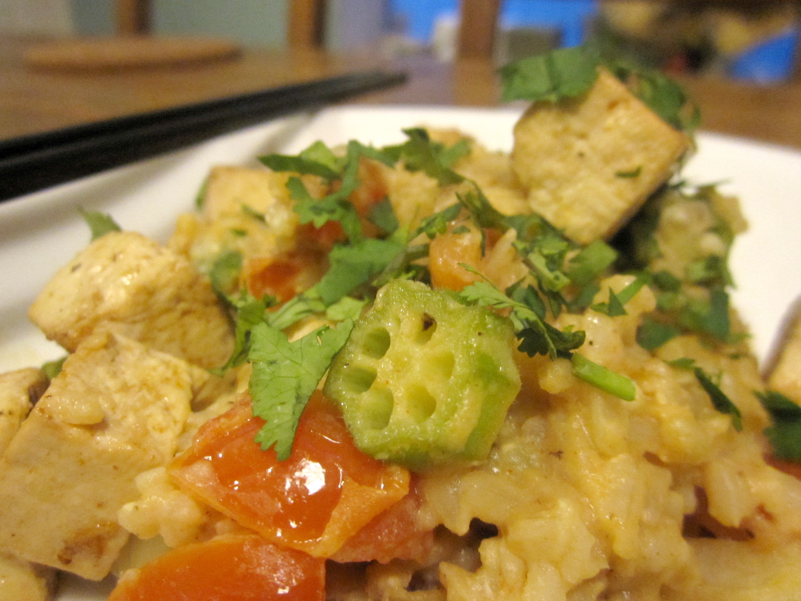 - Once the rice is cooked, add it to the vegetable mixture. Return to heat and pour the fried rice sauce all over the rice and vegetables and fold through the pan until the fried rice sauce covers the rice. Add tofu atop each serving of fried rice.