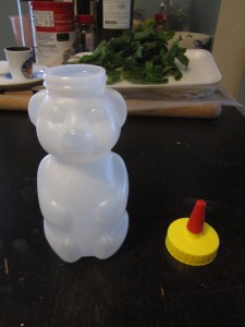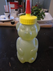 - Pour your syrup right into a bottle. I used a old happy bear honey jar.