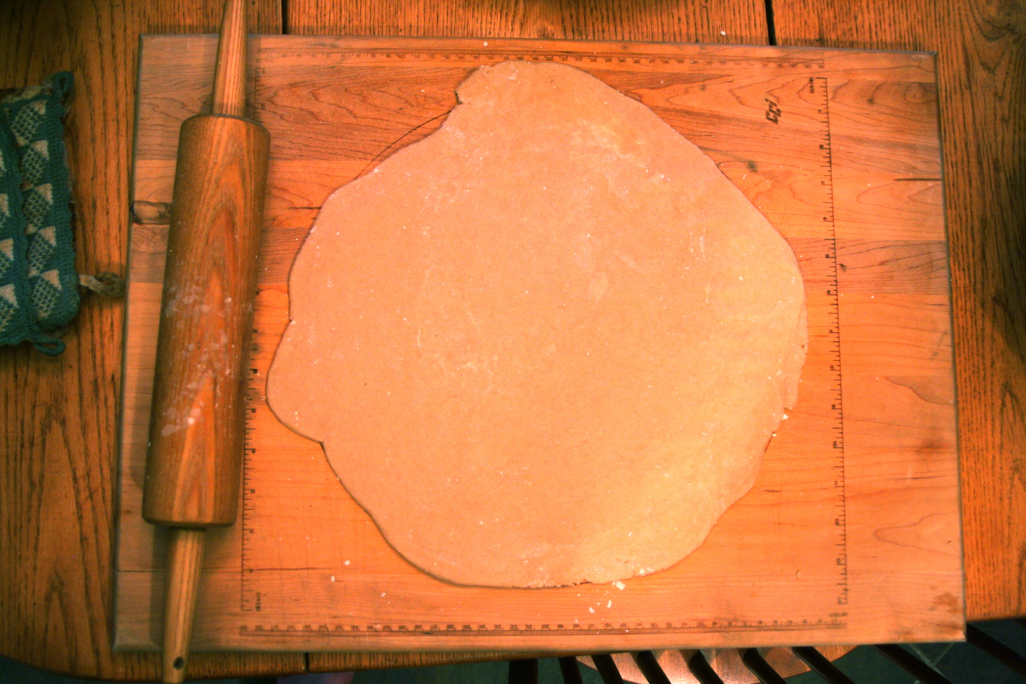 - Spread flour on a cutting board and on rolling pin. Roll out dough until its around 10-12″ wide