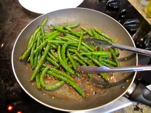 - In a pan over medium heat, warm the butter and garlic until melted. Add honey. Then, add green beans.