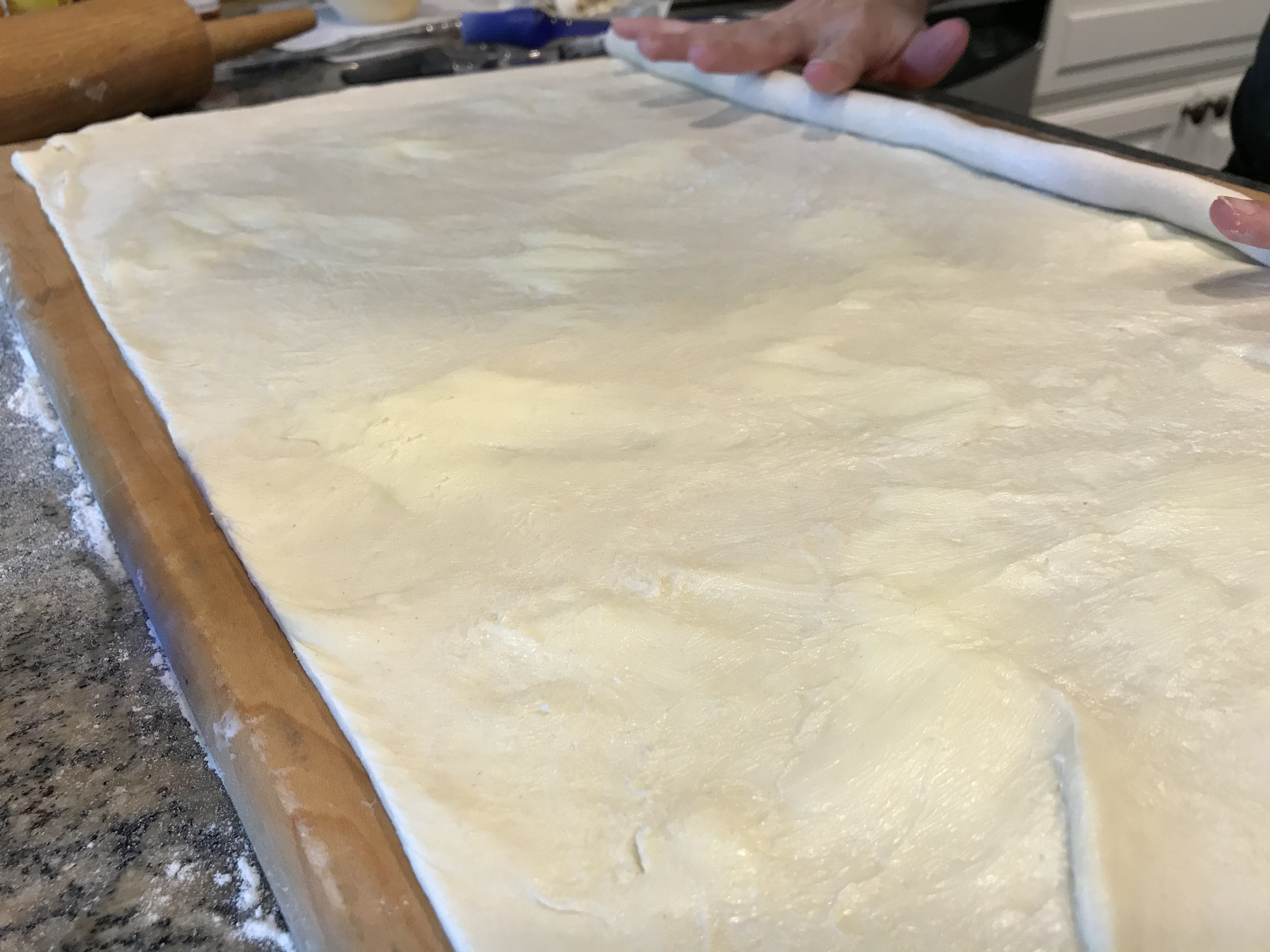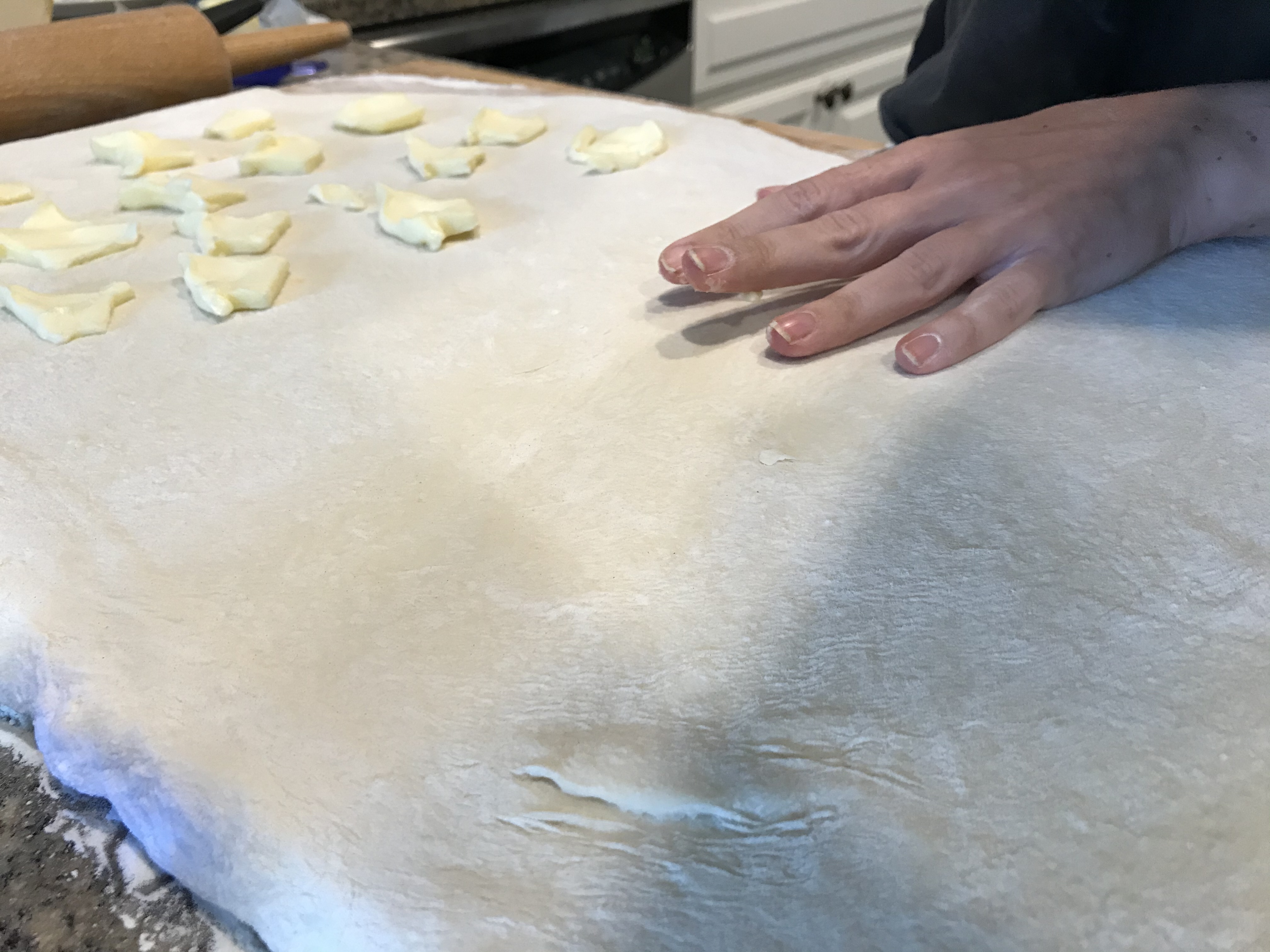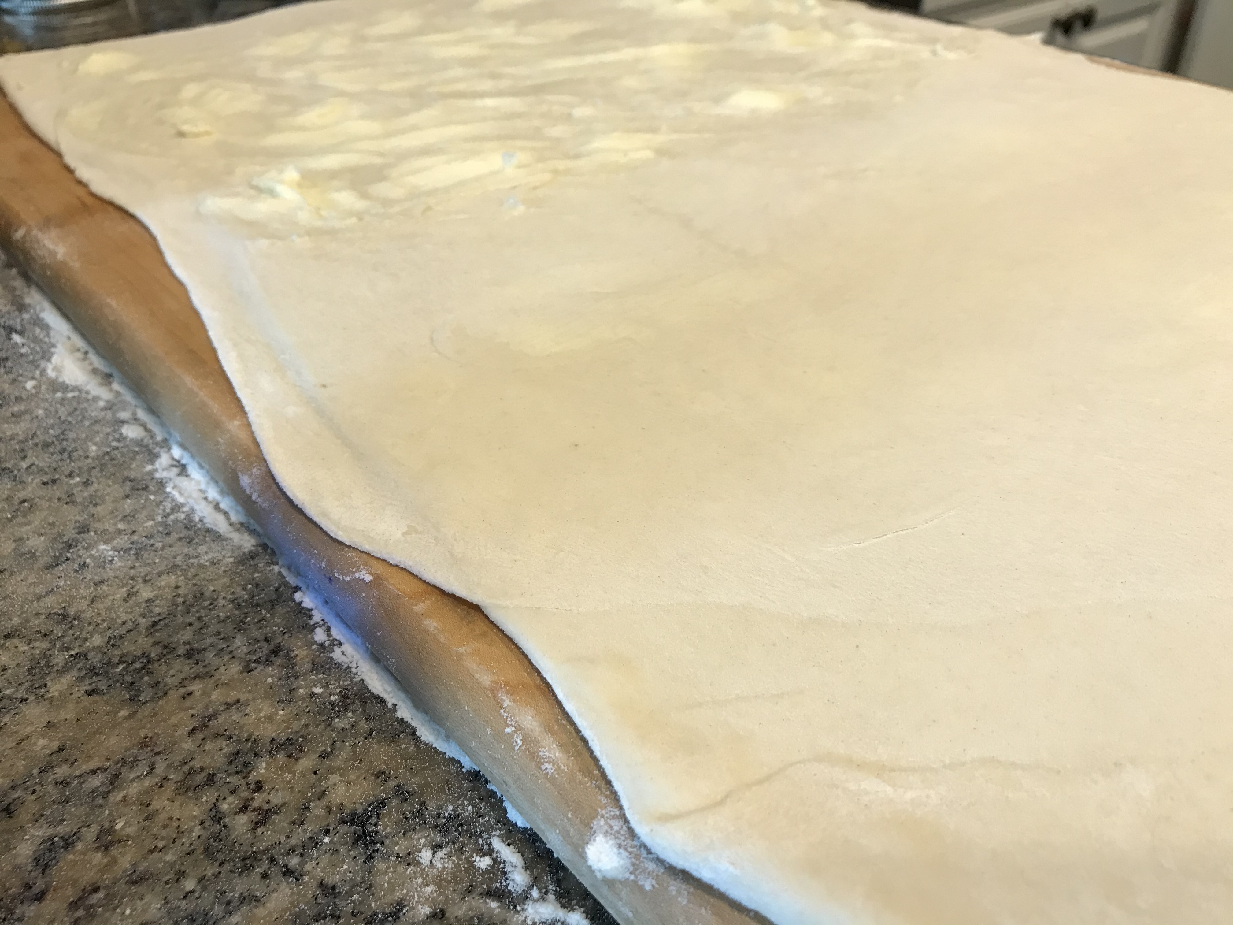 6. Roll it out again! Do the lamination again too. Another 1/3 of that stick of butter, on the right half of the dough. Fold it on itself, rotate 90 degrees, and roll out thin.