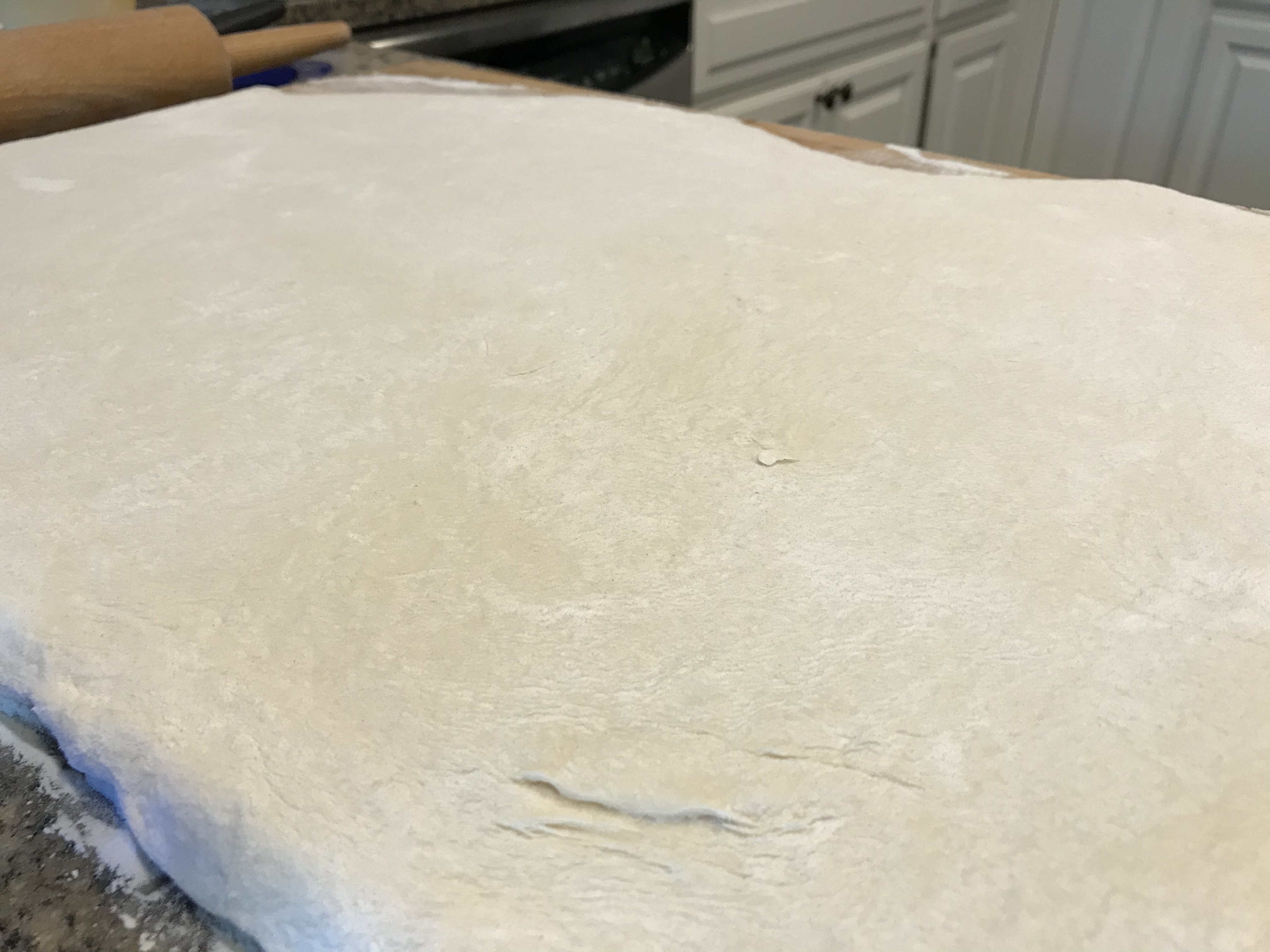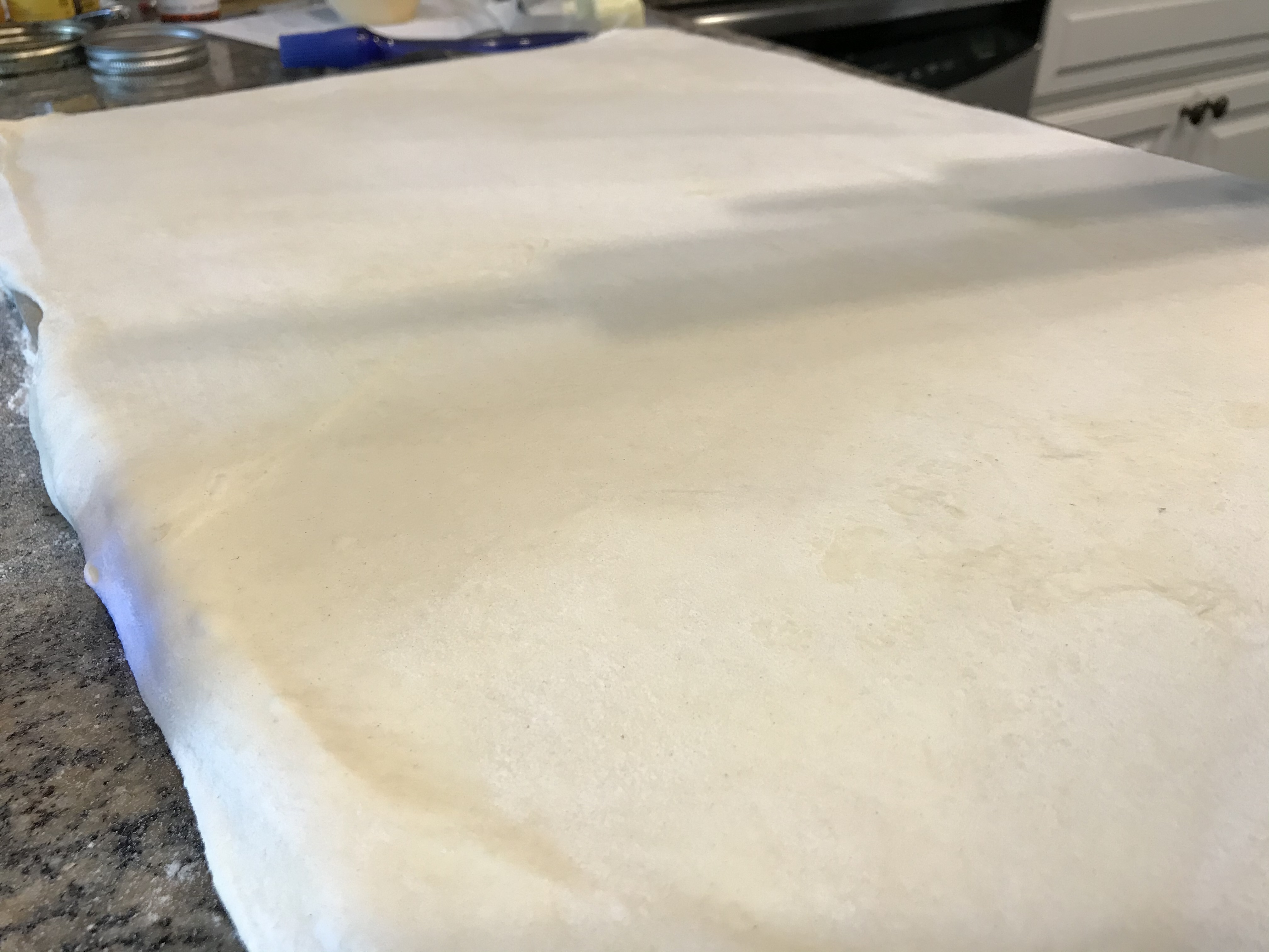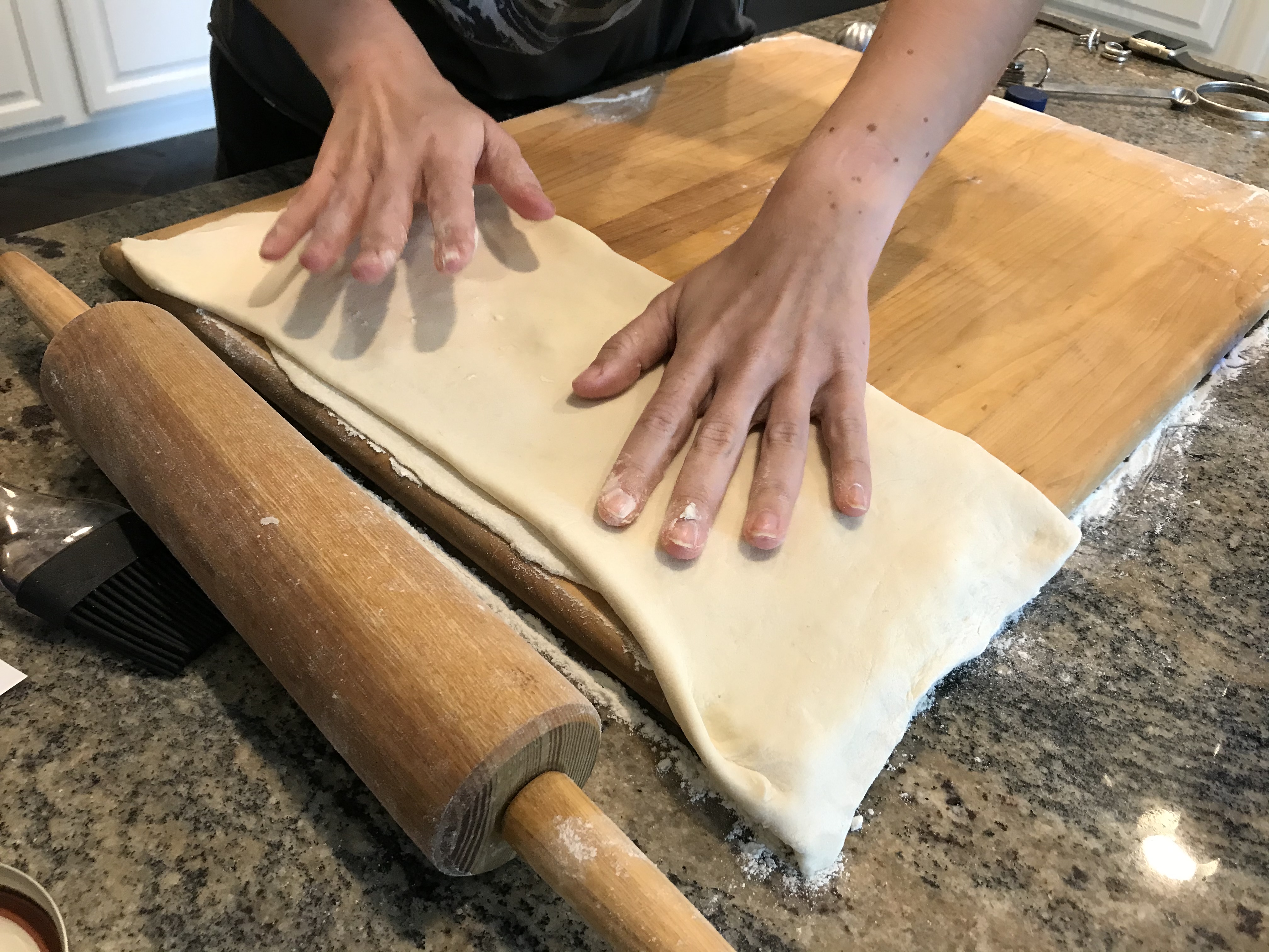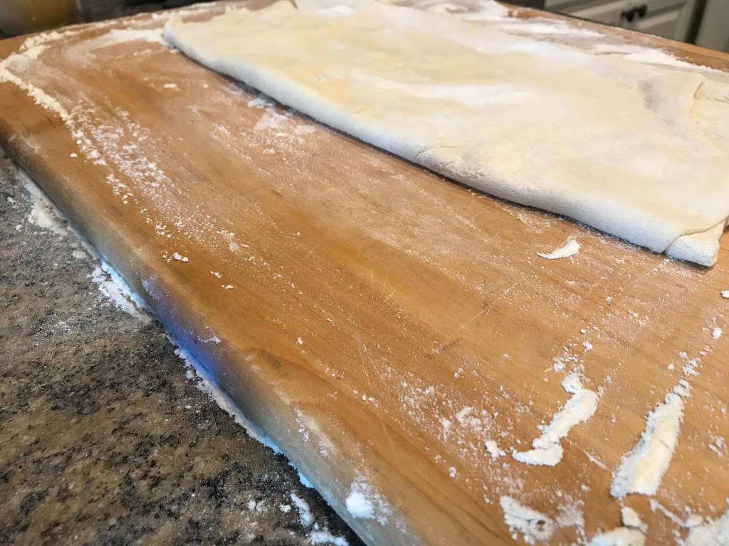 6. Roll it out again! Do the lamination again too. Another 1/3 of that stick of butter, on the right half of the dough. Fold it on itself, rotate 90 degrees, and roll out thin.