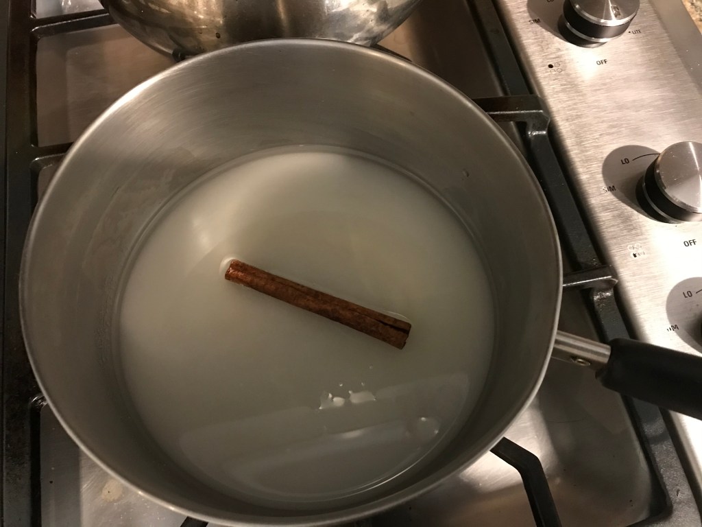 9. Get out two saucepans. In one, the cinnamon stick, water and sugar. Make sure to put it on low, stick a thermometer in, no stirring. Let the cinnamon impart it’s essence, organically.